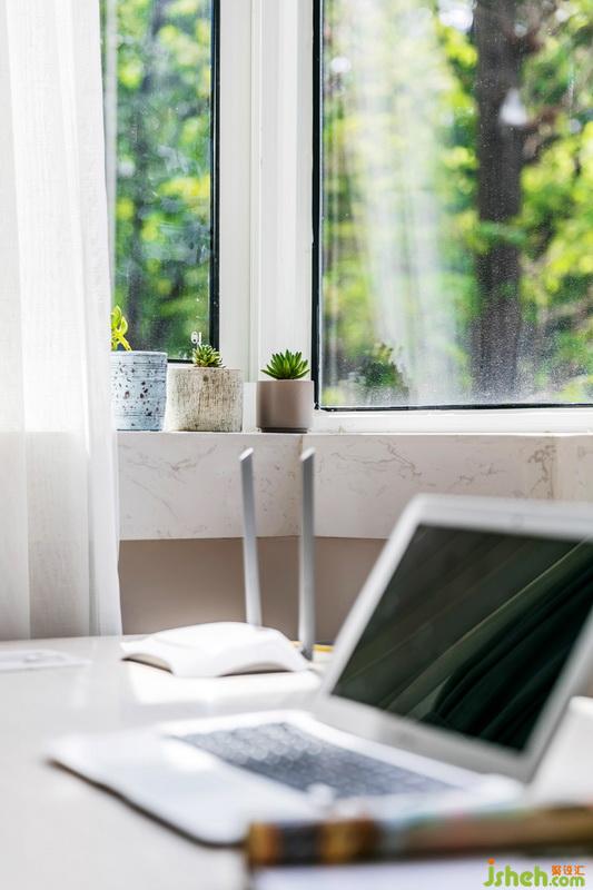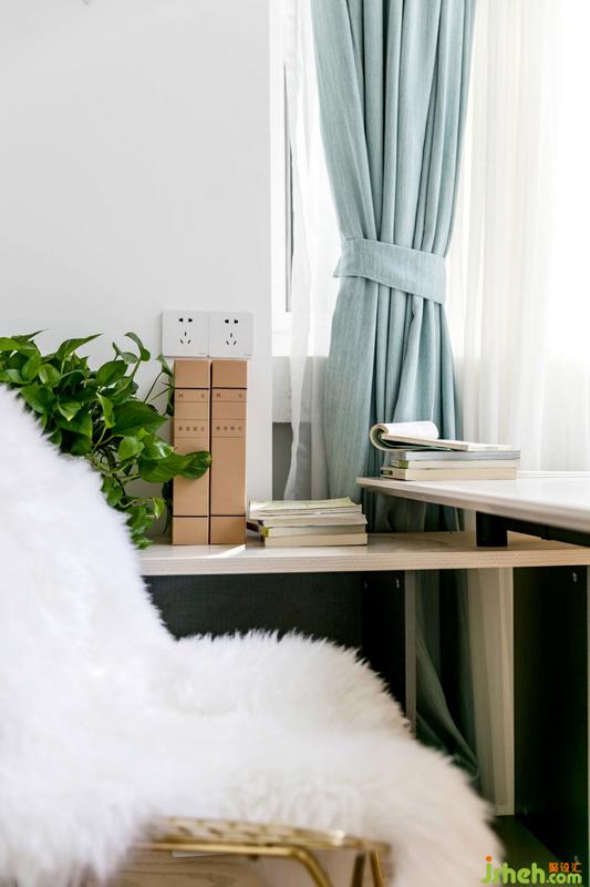 室內(nèi)設(shè)計(jì)師在主臥陽臺(tái)主要改造成王老師的工作區(qū),一張簡易的寫字桌搭配一把金色的貝爾托亞單人椅,整個(gè)空間通透明朗,無論春夏秋冬,無論辦公休憩,這個(gè)空間都是最好的去處,用我最喜歡的一句話,陽光為房間開了燈,更為適合不過了吧。