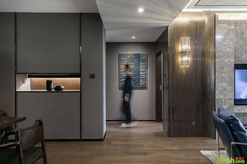 室內(nèi)設(shè)計(jì)師在設(shè)計(jì)手法上,門廳的地面使用了黑白根的石材,一是為了空間風(fēng)格的定調(diào),二是便于門廳區(qū)域的清潔;右手邊的鞋柜也是做了離地鏤空處理,顯得并不是太滿,同時(shí)又很方便出入換鞋,臥室門使用非標(biāo)定制到頂處理,與柜體面保持一致,與頂面橫平豎直,讓空間干凈利索,整潔統(tǒng)一。