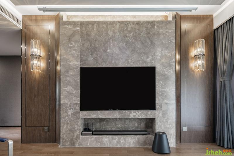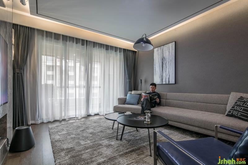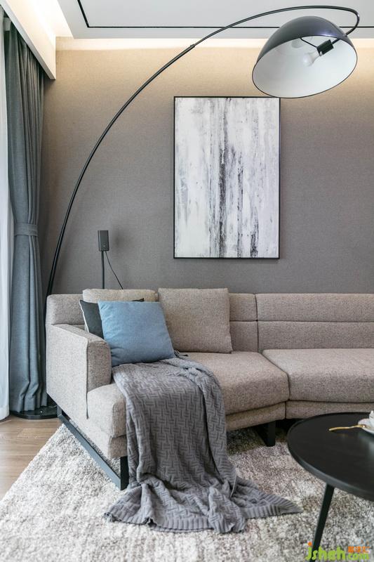 室內(nèi)設(shè)計(jì)師在電視墻的設(shè)計(jì)手法打破常規(guī),讓電視內(nèi)嵌墻體保持嚴(yán)謹(jǐn)?shù)凝R平,同時(shí)隱藏了插座線板,使得看上去統(tǒng)一干凈,沙發(fā)選用45°折角沙發(fā),配以黑色釣魚燈和不規(guī)則的掛畫,打造一個(gè)穩(wěn)重又精致雅痞的空間感受。