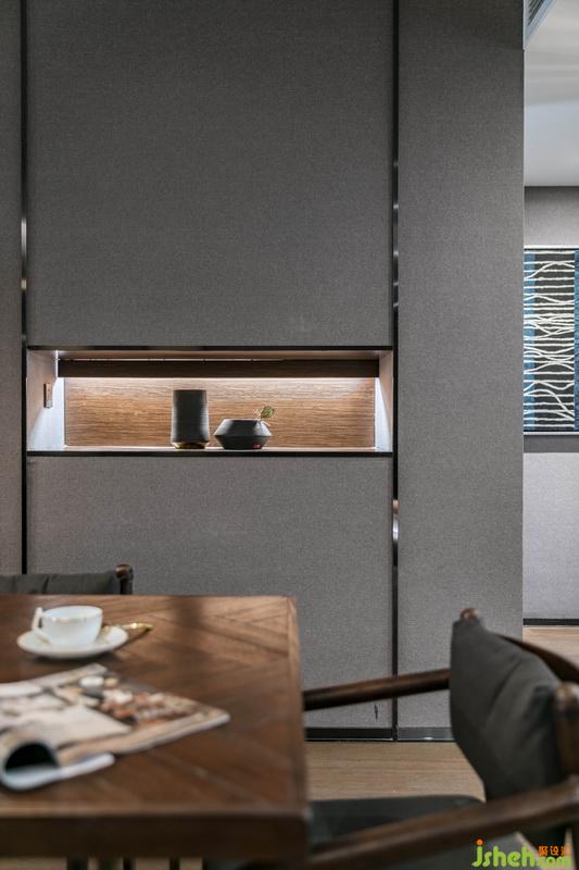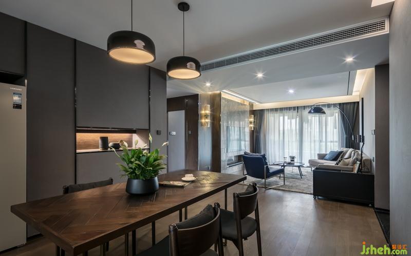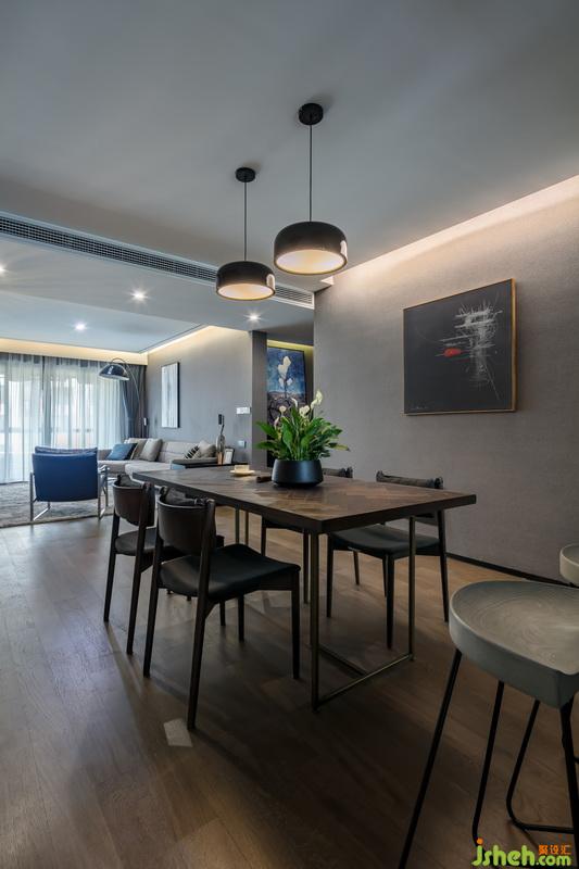 室內(nèi)設(shè)計(jì)師將客餐廳硬裝以紳士灰作為主色調(diào),沉穩(wěn),溫和,又不失時(shí)尚優(yōu)雅。軟裝上面采用黑白灰的過渡,點(diǎn)綴胡桃木色,增加了溫度;配以黑色霧面與鏡面不銹鋼,拉升了整體空間的品質(zhì)感。
