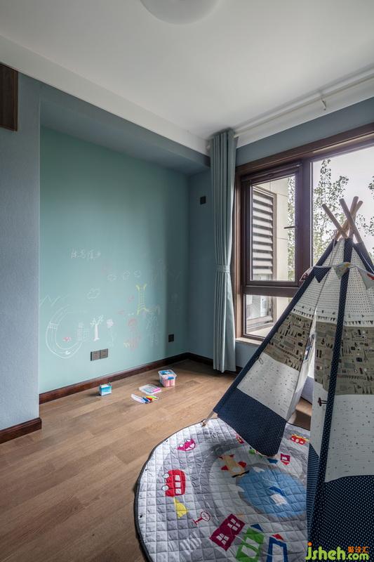 兒童娛樂(lè)室,孩子的世界里,永遠(yuǎn)是豐富多彩的。設(shè)計(jì)考慮到業(yè)主家的孩子正在成長(zhǎng)階段,涂刷一面有色繪圖墻,留給孩子隨意圖畫(huà)。