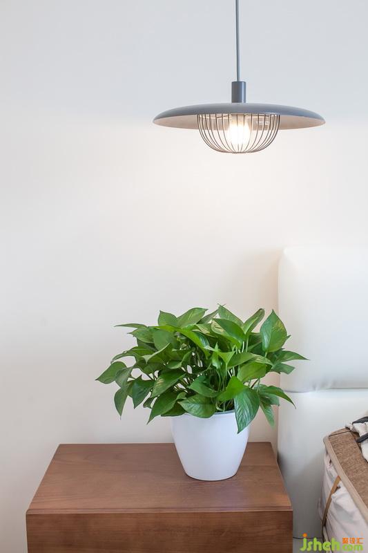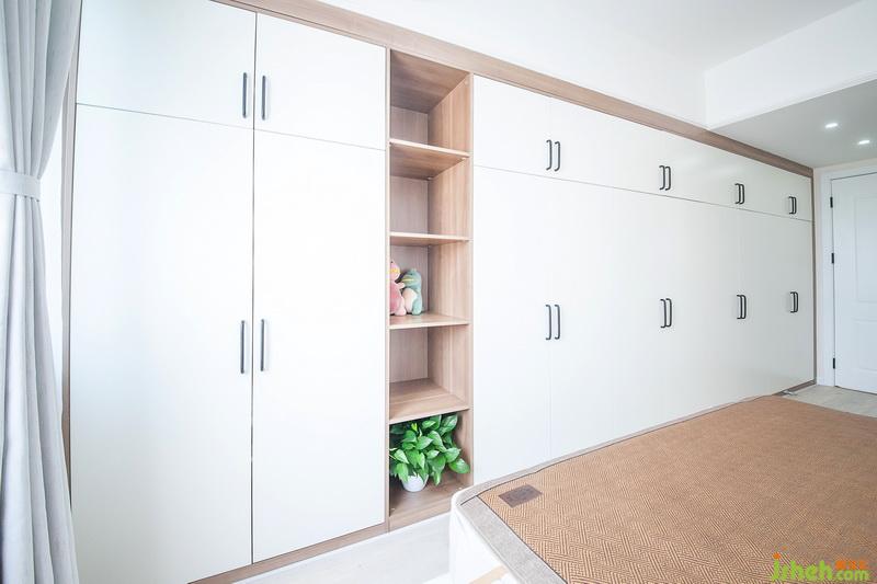 室內(nèi)設(shè)計(jì)師將主臥一整面墻的柜子在功能上滿足了男女主人公的收納需求,淺色柜體與簡(jiǎn)單的一小柜一小桌,不會(huì)讓空間擠壓。