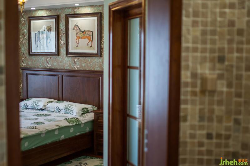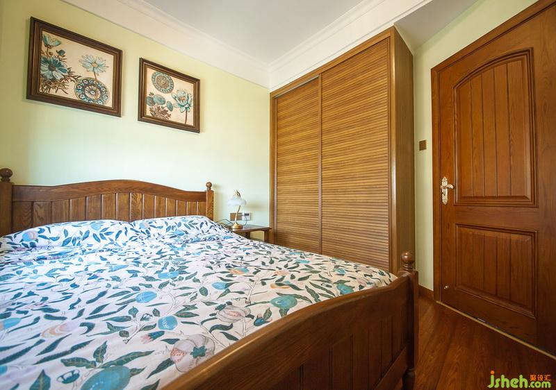 次臥為老人房,暖黃色的墻漆搭配素凈的掛畫,端莊沉靜,有著溫暖的氣息。