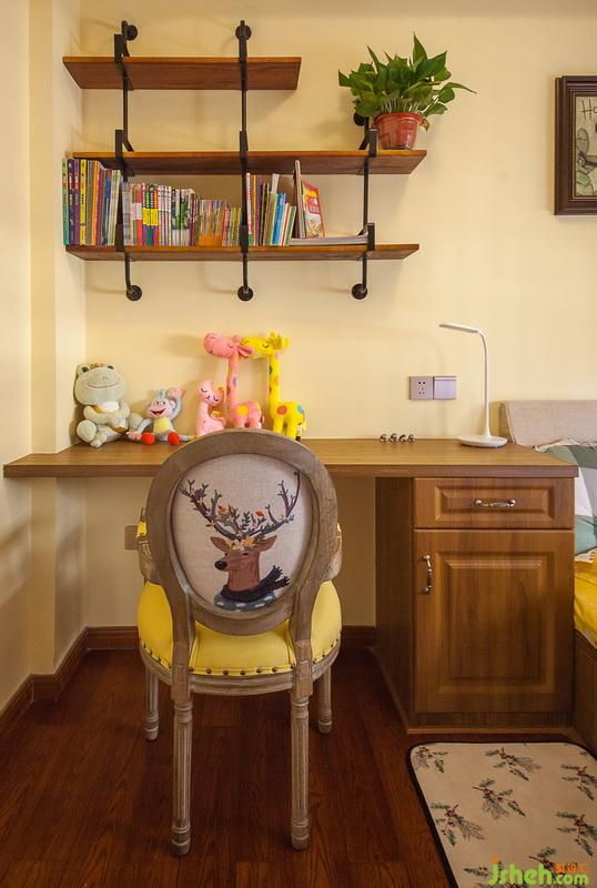兒童房用黃色作為主色調(diào),為空間增添活潑輕快感。專屬設計金屬水管書架,讓美式風格里糅雜著孩子喜歡的工業(yè)風。