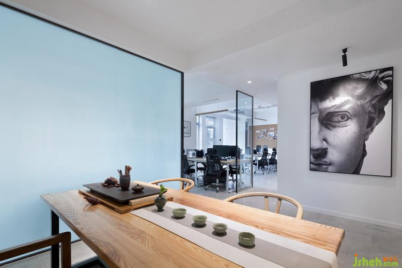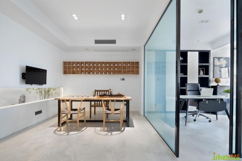 我們用可調(diào)控的霧化玻璃圍造了獨立的辦公空間,日常時調(diào)為可視狀態(tài),將自然光線引入品茶室。需要的時候調(diào)為不可視狀態(tài),方便洽談。