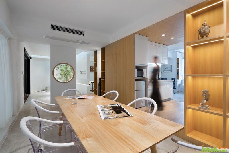 半開放的會客室,既不會受其他空間的影響,也能給客戶帶來精神上的松弛,盡情闡述他們對家的暢想。選擇透明色澤的幽靈椅搭配原木的會議桌,輕靈優(yōu)美且降低空間占據(jù)的視覺感受。