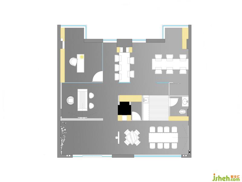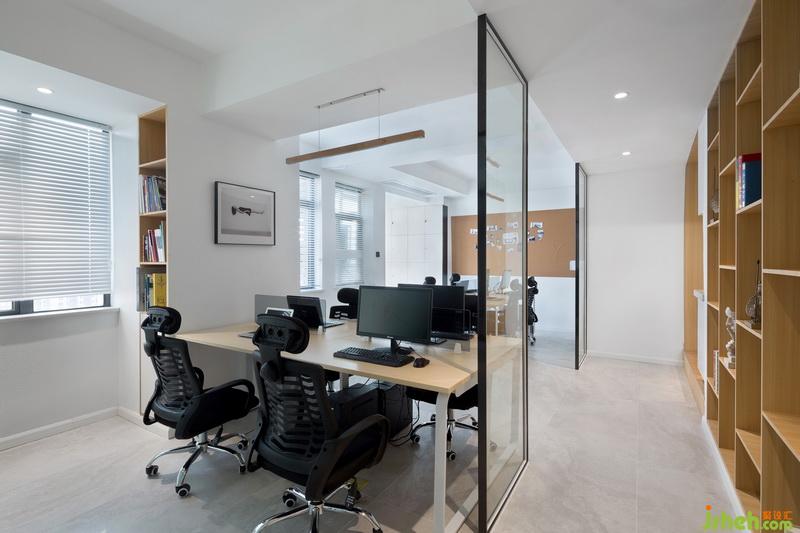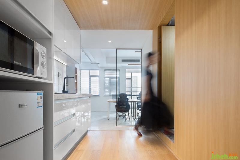 辦公區(qū)與會客區(qū)之間做一個抬高,作為水吧臺,賦予它生活功能。