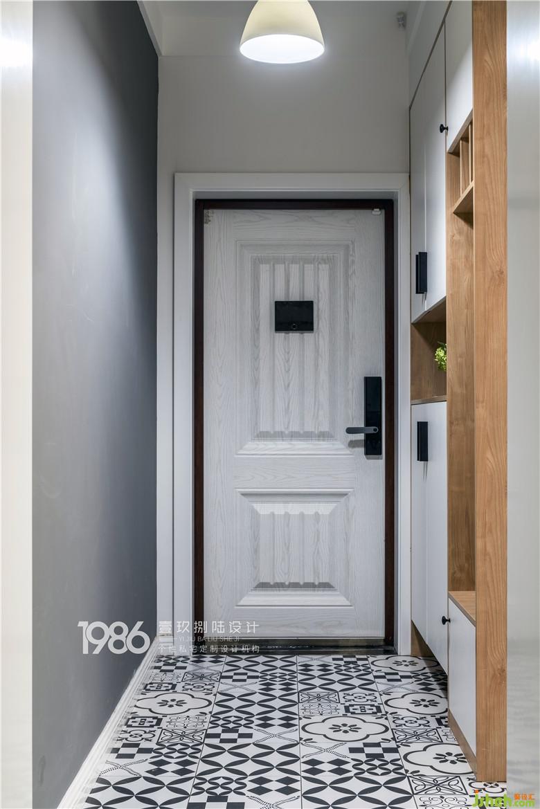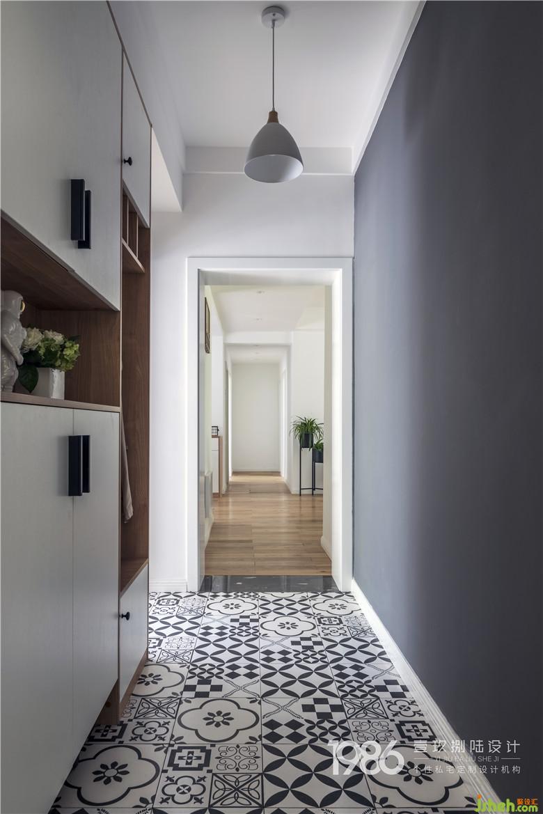 而門廳另一側(cè),用整面手繪黑板墻裝飾,這里將會成為孩子的涂鴉區(qū)域,放飛孩子天性又不用擔(dān)心家中的其他區(qū)域被涂抹。白色的入戶門與白色鞋柜,室內(nèi)設(shè)計師搭配黑白花紋的地磚,讓入戶區(qū)域整體協(xié)調(diào)而又不逼仄。