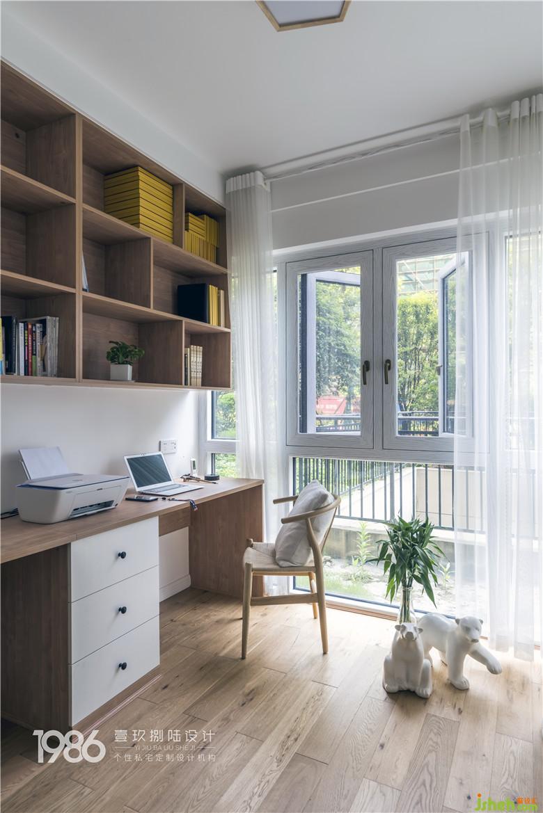 書房在布局時便將它與臥房區(qū)域分隔開來,在玄關(guān)旁邊遠(yuǎn)離需要安靜的睡眠區(qū)域,在這里主人可以安心學(xué)習(xí)和工作。為了讓兩位主人學(xué)習(xí)工作時不沖突,室內(nèi)設(shè)計師給書房設(shè)計了兩人位的書桌。