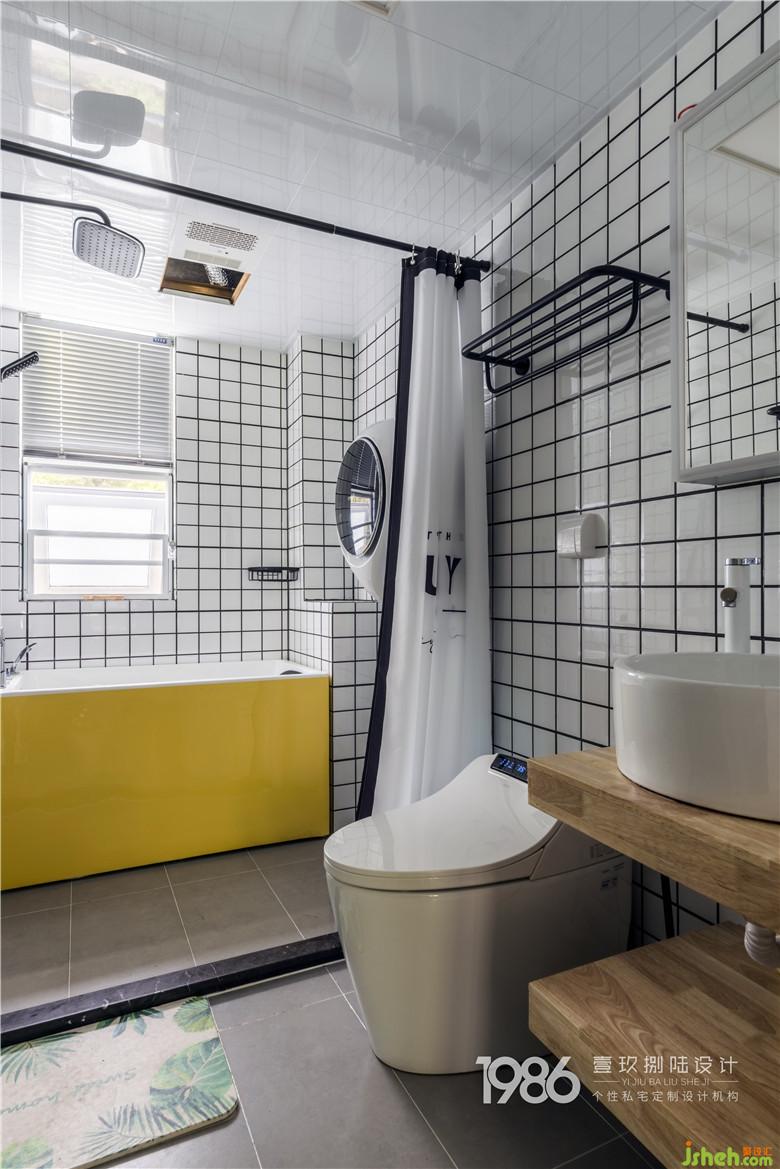 主衛(wèi)和次位都實現(xiàn)干濕分區(qū),方便平時的使用與衛(wèi)生處理。主衛(wèi)明黃色的浴缸照亮了整個空間,暖暖的泡浴給予身心一種愉悅的放松;次位馬桶旁室內(nèi)設(shè)計師有為老人設(shè)計的扶手,小小的細(xì)節(jié)是這個家溫馨的點點滴滴。