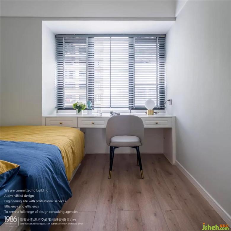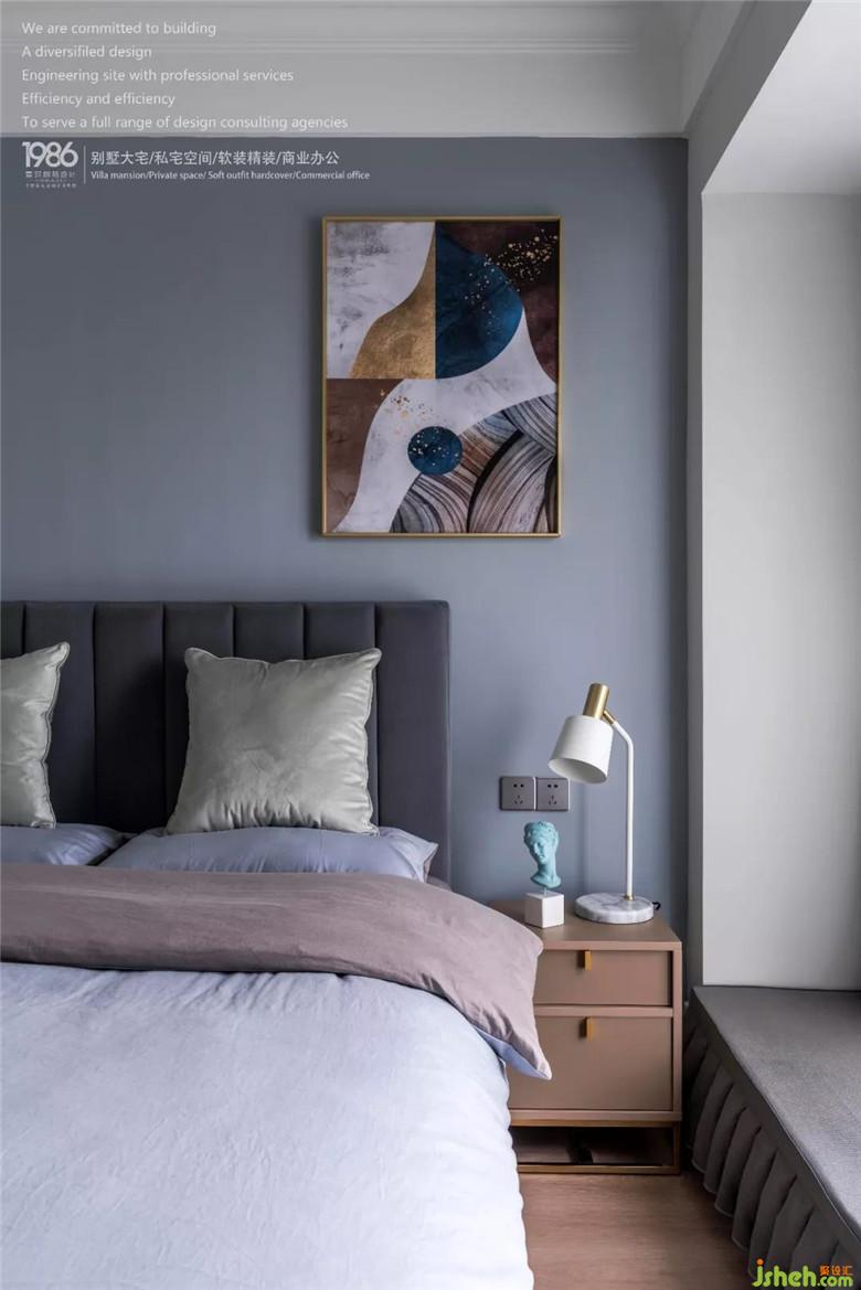 次臥摒棄了不必要的裝飾,裝修公司給造型做減法,用高級(jí)的藍(lán)灰色作為主調(diào),搭配深灰色,營(yíng)造出藝術(shù)感。