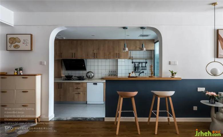 餐廳及廚房的開(kāi)放式設(shè)計(jì),裝修公司結(jié)合原木層板式的吧臺(tái)機(jī)能,滿(mǎn)足了男女主人的燭光晚餐或是與三五好友愜意地把酒言歡。