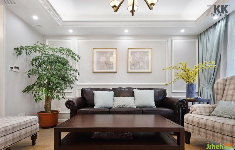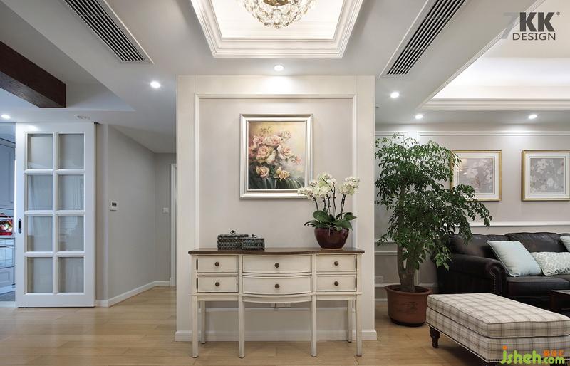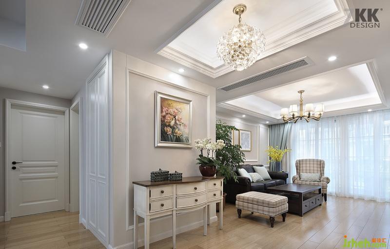 從玄關(guān)看客廳,整體白色搭配藍(lán)色窗簾給這個夏天增添一抹清爽的感覺。美式風(fēng)格線條感干凈利落,使空間感干凈明亮。