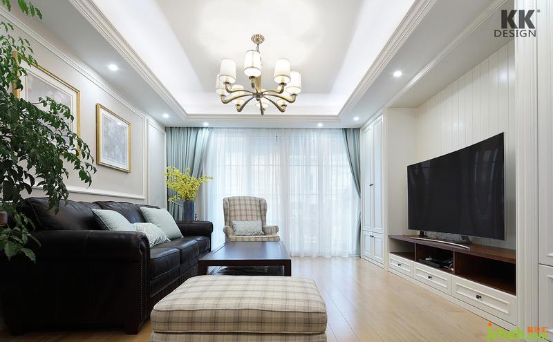客廳區(qū)域電視背景墻做了大量的儲藏柜體設(shè)計,整體美觀實用。