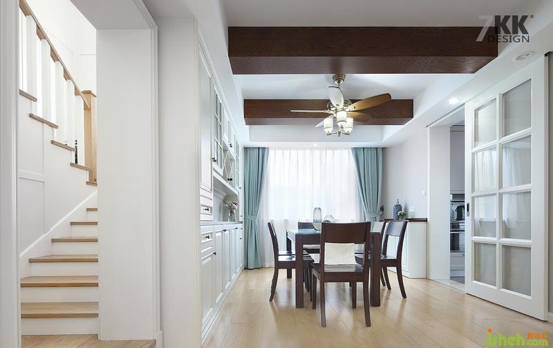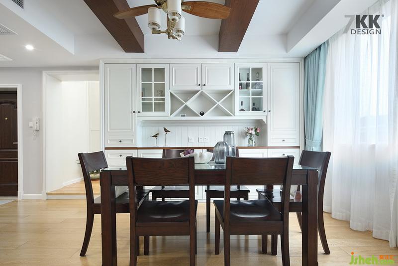 餐廳深色木質(zhì)的餐桌椅,吊頂也是用木條裝飾,個性的吊燈和風(fēng)扇搭配,也成了一道獨特的風(fēng)景。桌邊的餐邊柜既是裝飾柜又是比較實用的收納柜。