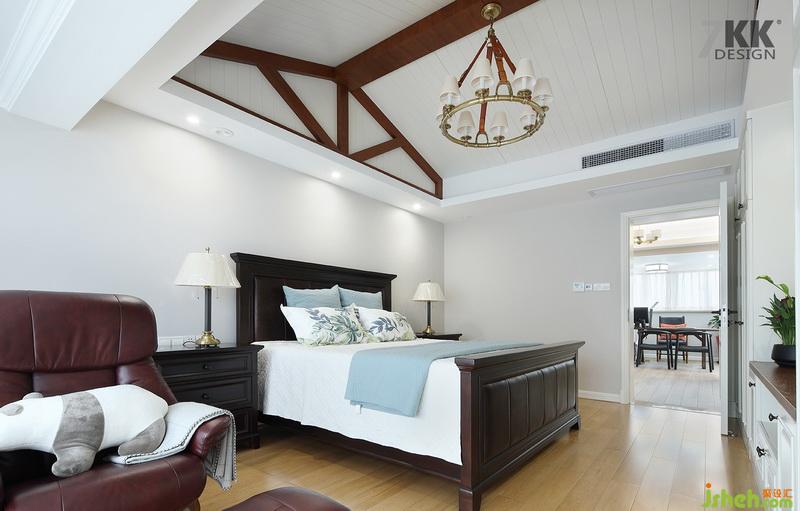 主臥,穩(wěn)重的木質(zhì)床框,獨特的藝術吊頂,延伸了空間感,旁邊的懶人沙發(fā),一本書一杯咖啡就能度過一個下午。