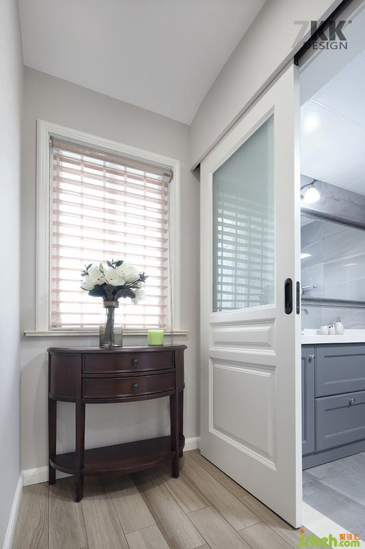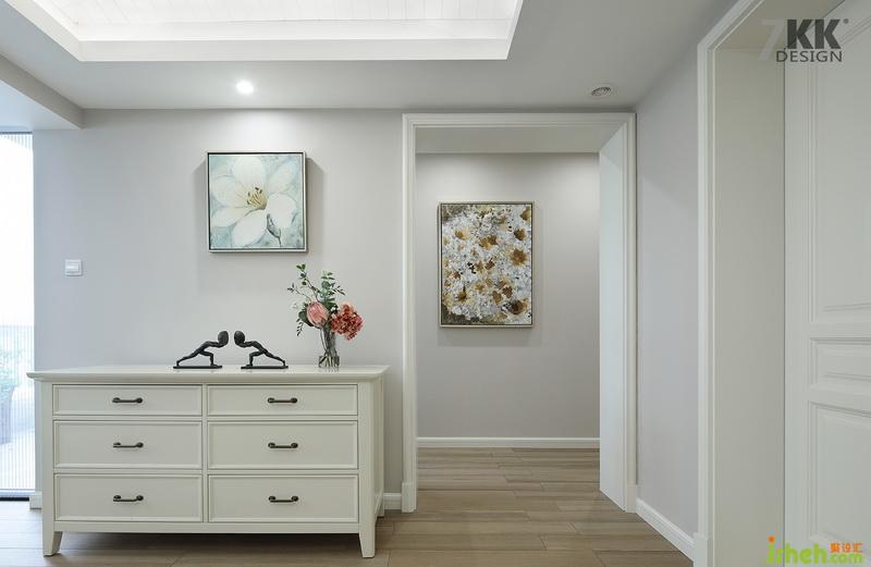 設計公司在靠近衛(wèi)生間的一側走廊放置了一張裝飾邊柜。角落的風景。