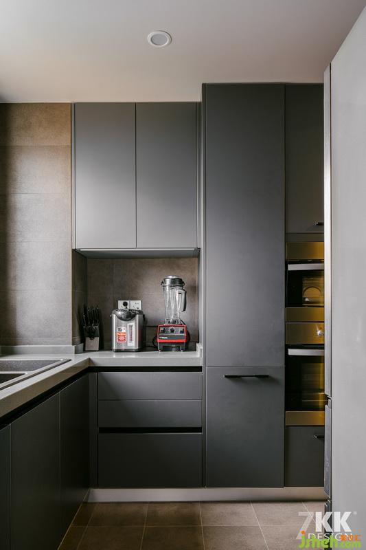 廚房室內(nèi)設(shè)計(jì)師采用深灰色為主色調(diào),合理設(shè)計(jì)儲(chǔ)藏柜的存放空間,大大的滿足了業(yè)主儲(chǔ)藏的需求。