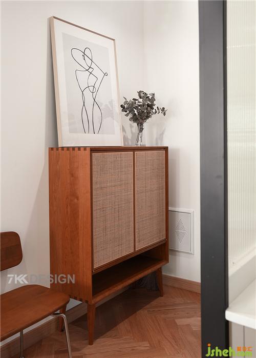 玄關進來重新砌墻,后面空間納入主臥做衣帽間,正對墻面放置成品的帶編藤的木質(zhì)鞋柜,環(huán)保實用,透氣性好,可以用來放置平常要穿的鞋子。上面擺放簡約具體線條感的藝術裝飾畫和綠植搭配,使得進門眼前一亮的,很有畫面感。