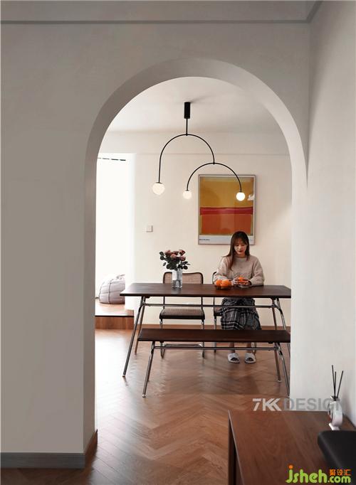 從客廳看餐廳,原始次臥門去掉做成拱形門,增加了居家的趣味性。生活的美好之處在于,可以和家人在溫馨的傍晚一起共進晚餐,上海裝修設計在柔和的燈光下,在美味的佳肴中細數(shù)著今日份的美好。