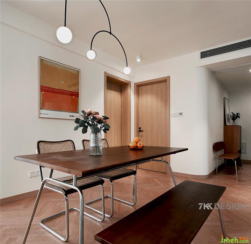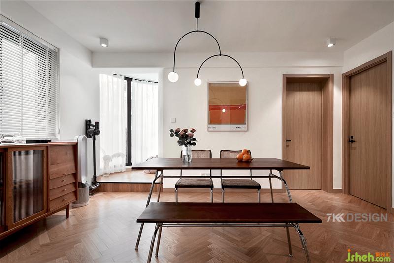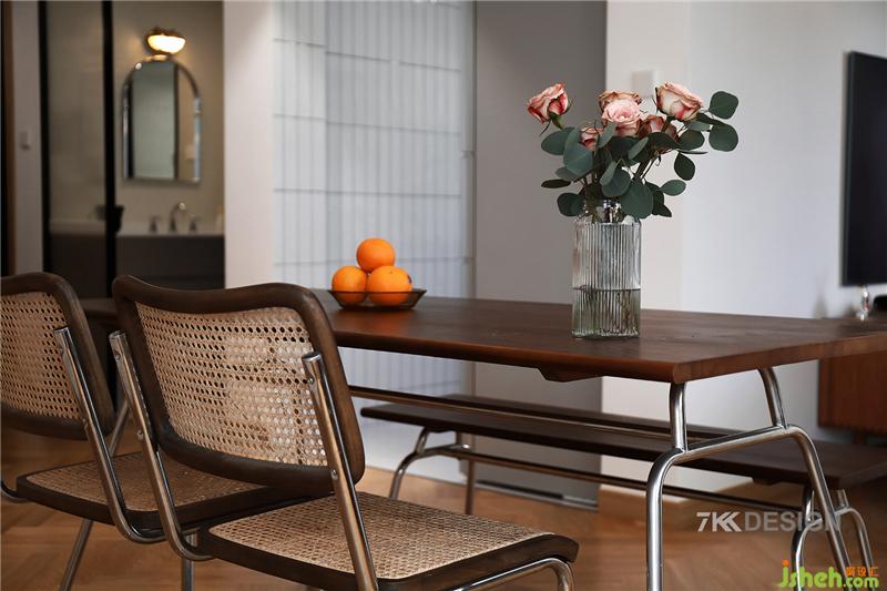 胡桃木的餐桌椅和地板不同深淺的木質(zhì)色調(diào),豐富整體空間的層次,很有質(zhì)感。