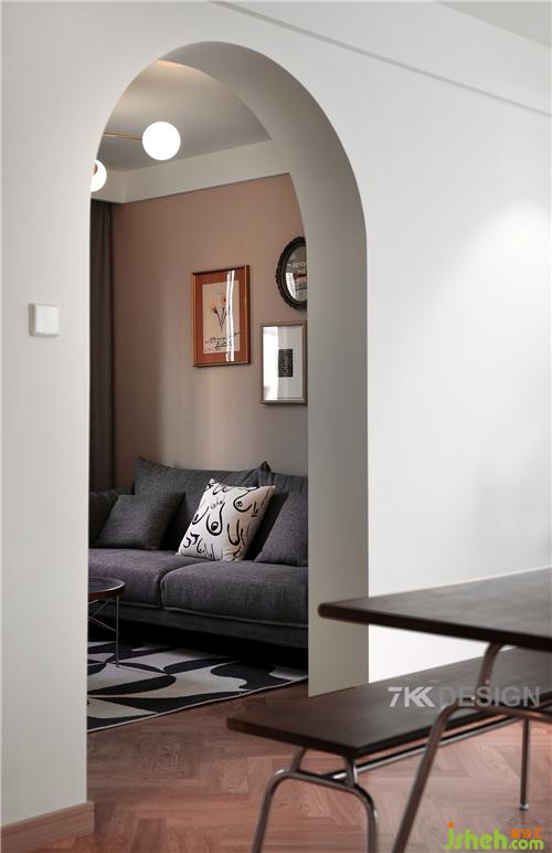 透過拱門看客廳,灰色布藝沙發(fā)搭配黑白地毯,墻面的裝飾畫,呈現(xiàn)出復古,寧靜,又不失精致的感覺。