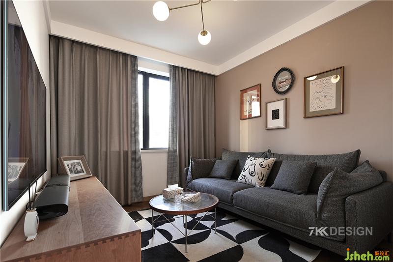 考慮到客廳空間的面積比較偏小,只有3.2m*2.7m,沙發(fā)背景墻采用比較柔和的色調(diào),力至打造溫馨舒適的起居空間。因為平時就業(yè)主夫妻二人居住,兩人窩在沙發(fā)上看電視,很是溫馨浪漫。墻面圓形的裝飾掛畫,圓形的茶幾,弧形元素的地毯,和拱形門的造型起到相互應的效果,充滿著樂趣。
