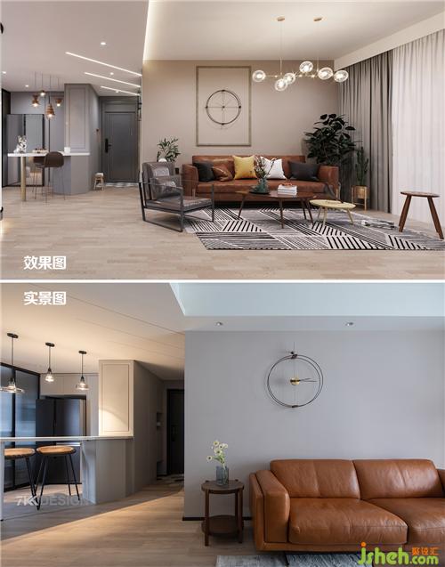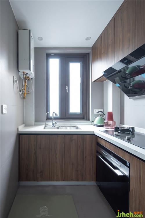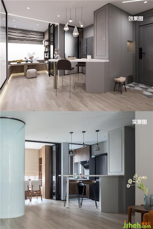效果圖與實景圖對比。 原本的廚房拆掉之后,分成了兩個比較迷你的雙廚房,麻雀雖小,五臟俱全。里面是個小的中廚們,雖然小夫妻不怎么做飯,但是他們父母也會偶爾過來給他們做點吃的。