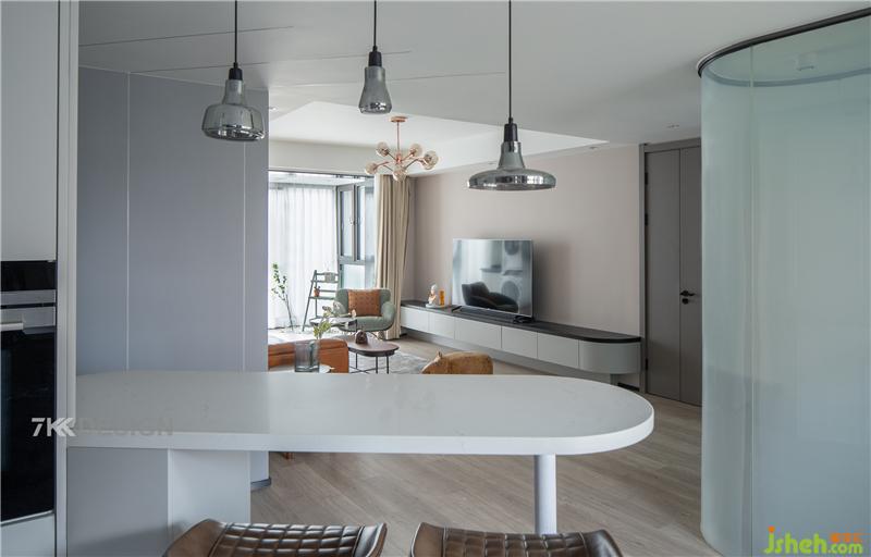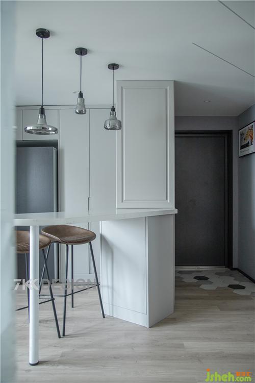 吧臺的設計很巧妙,動線是斜上的,不會影響到走廊的動線,在一定程度上也是借用走廊的空間感,成為設計的一個亮點,吧臺造型既有創(chuàng)意感,又在創(chuàng)意上結合很多實用性。 吧臺一側是設備柜,嵌入式烤箱+冰箱,定制使得空間更好的利用,增加更多廚房的收納。