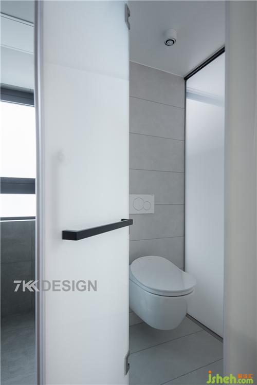 打開衛(wèi)生間燈光。 衛(wèi)生間使用漸變的霧化玻璃設(shè)計(jì),上半節(jié)是透明,底下是完全霧化,打開開關(guān)時(shí)就完全變成霧化,完全看不見里面,里面也看不見外面,會保證一定隱私性。 沒有人使用的時(shí)候上半節(jié)是透明的,這樣這個(gè)衛(wèi)生間的存在不會對于客廳和餐廳之間這個(gè)凸角不會太突??臻g看起來更完整,對于這樣的客廳餐廳空間設(shè)計(jì)也是達(dá)到極致又非常有創(chuàng)意。 對于淋浴房浴室門打開之后,有一個(gè)過渡的區(qū)域中間玻璃做隔斷方便換衣服,洗澡,也避免一進(jìn)門就看到淋浴房也比較尷尬。采用現(xiàn)在流行的無地漏的像酒店一樣的排水設(shè)計(jì),非常干凈整潔。