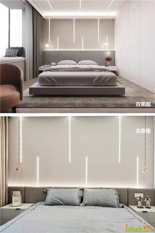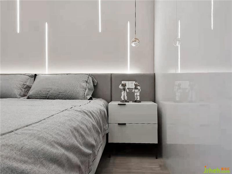 主臥的未來科技感也很強(qiáng),實(shí)際上就是用燈帶營造出來的設(shè)計(jì)感,而簡單的設(shè)計(jì)更能突出未來的設(shè)計(jì)一切以極簡主義為主。 主臥床頭背景墻硬包材質(zhì)與乳膠漆拼接和頂部都采用內(nèi)嵌式燈帶上海裝修設(shè)計(jì),一側(cè)墻面采用白色亞克力,更加增加了光線的反射亮度,營造一種時(shí)尚炫酷科技感的睡眠環(huán)境。
