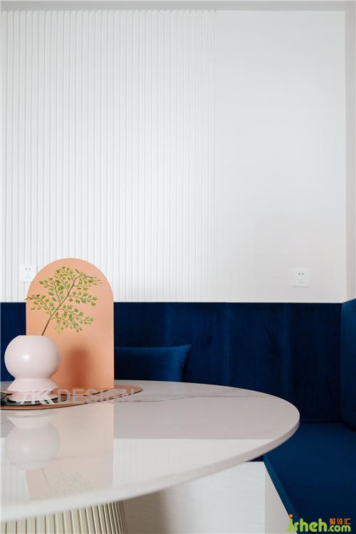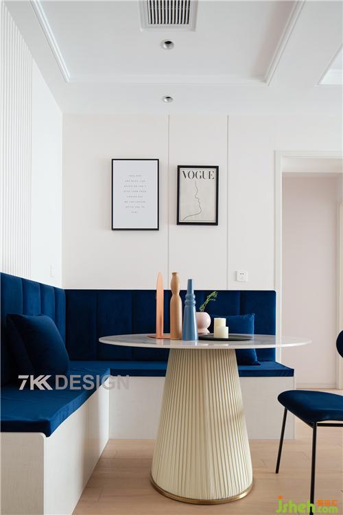 卡座的坐墊及后背選擇了藍色調(diào),大理石白色桌面加乳白色支撐的圓形餐桌,搭配同樣藍色系的餐椅。因為家里有小孩,在餐桌餐椅及沙發(fā)等家具上都盡量選擇了弧形的元素,能讓空間減少直角的鋒利感,弧線讓空間感更柔軟。