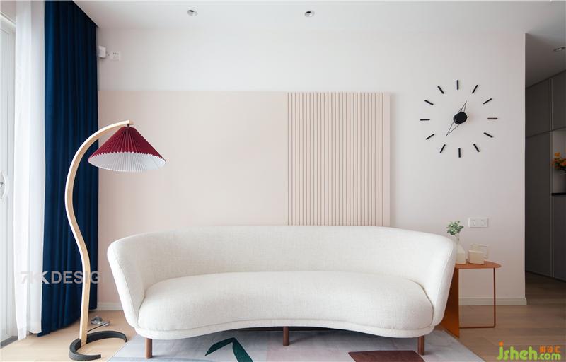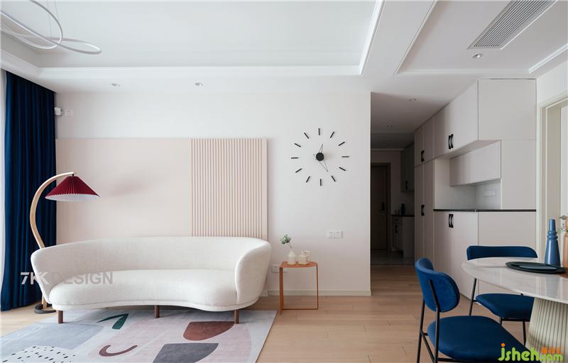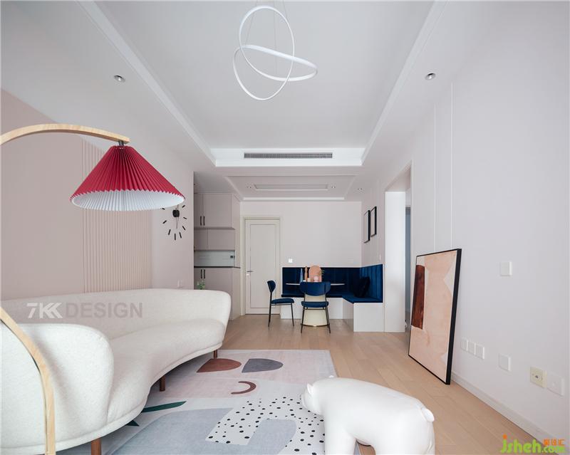 客廳整體延續(xù)餐廳白色的基底,粉色作為輔助色系,粉色是女業(yè)主比較喜歡的顏色,剛好孩子也是女兒,想打造清新浪漫的居家氛圍。
