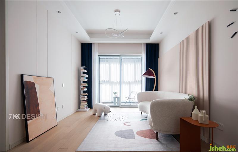 乳白色沙發(fā)柔和的弧形線條與粉色背景墻的垂直線條分割出純淨(jìng)質(zhì)樸空間的層次感、韻律感。一抹綠色點(diǎn)綴賦予空間清新的活力。