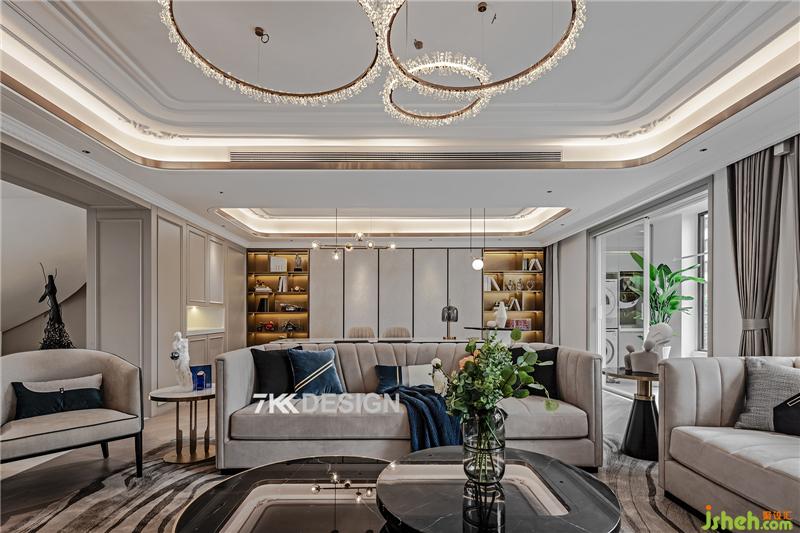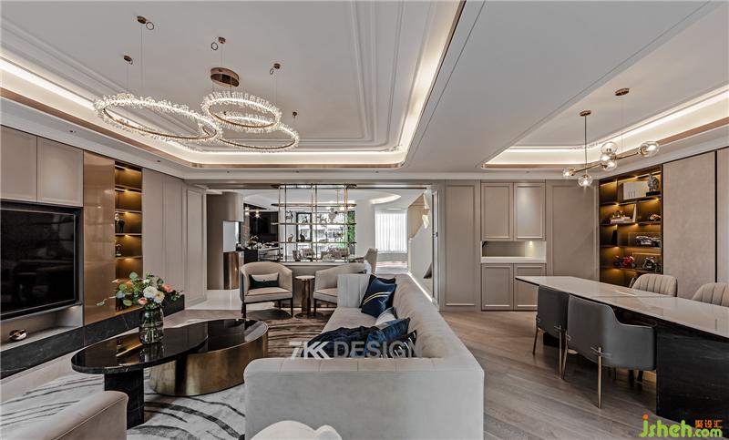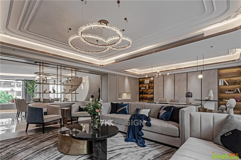 這是一套大平層復式,平層里面的豪宅。地段很好,在閔行的榮信虹橋世嘉。業(yè)主有一個上小學的兒子,一定程度上的富二代家庭。業(yè)主父母一輩是從事相關建筑行業(yè)的。他們對生活品質追求比較高。因為是復式考慮到便利性的問題,老人住在一層樓, 2樓基本上是這對小夫妻為主的活動空間。整個房子空間比較寬敞,但是每個區(qū)域之間如何去連接好,如何設計出一定的比較高品質的格局以及效果,還是需要有一定的設計要求的。