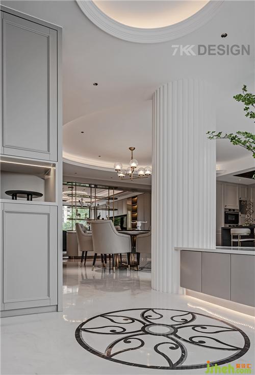 客餐廳兩邊大面積的落地窗讓室內光線更充足的設計,視野更寬闊。整體餐廚地面淺色紋理地磚拼接,美觀又容易打理。餐廳餐桌選擇圓形桌子搭配,與圓弧吊頂相呼應,吊頂旁邊的的圓柱包起來,整體風格打造歐式輕奢帶點時尚的元素。整個顏色色調也不是很深。