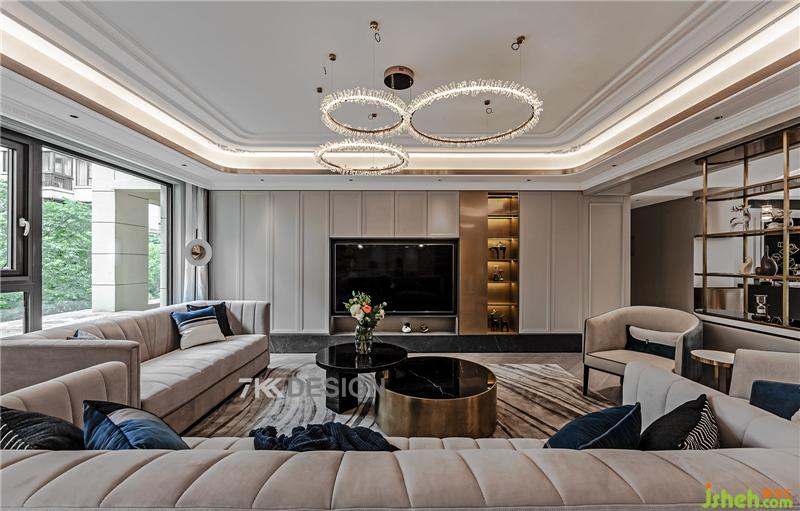 從客廳看親子活動區(qū)域,透過鏤空裝飾隔斷看餐廳玄關區(qū)域??蛷d和親子活動區(qū)開放式設計,吊頂分開處理,歐式線條吊頂與精致吊燈搭配,讓空間更具層次感,奢華大氣??蛷d沙發(fā)三面半包圍環(huán)繞式擺設,有著對稱的美感。沙發(fā)選擇淺灰色,與餐廳整體色調協(xié)調,搭配深藍色絲絨抱枕點綴給人一種眼前一亮的碰撞感。