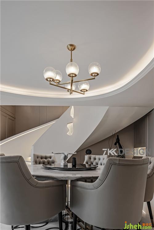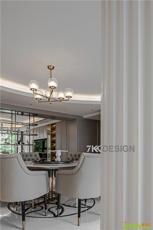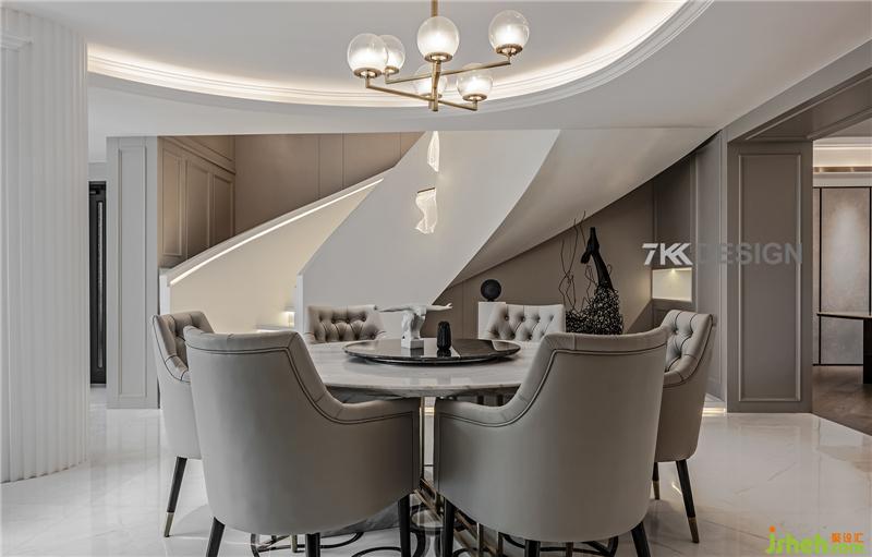 生活中的儀式感,從優(yōu)雅地用餐開始,餐廳整體色調(diào)都以淺色系為基調(diào)。餐廳餐桌選擇圓形桌子搭配,與圓弧吊頂相呼應(yīng),吊頂旁邊的的圓柱包起來(lái),整體風(fēng)格打造歐式輕奢帶點(diǎn)時(shí)尚的元素。