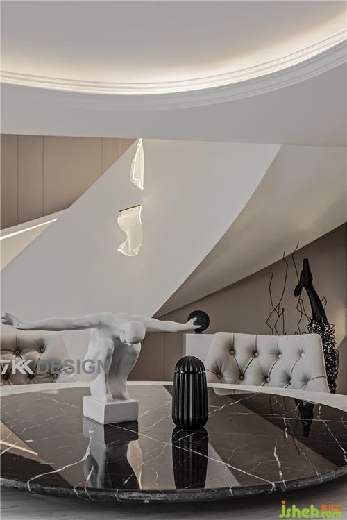 地上圓弧的設(shè)計(jì)一直延伸到最里面的空間。地上和頂上分別會(huì)有大理石拼花和頂上的圓弧吊頂設(shè)計(jì)進(jìn)行相呼應(yīng)。整體呈現(xiàn)一個(gè)圓弧形的入戶門廳。