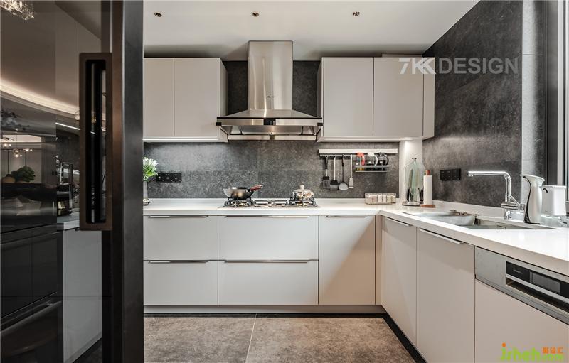 中廚是標(biāo)準(zhǔn)的U型設(shè)計(jì),非常寬敞,實(shí)用性,里面容納一個(gè)雙開(kāi)門(mén)的冰箱作為大宅的標(biāo)配。中廚臺(tái)面與上下柜體采用白色系,墻面采用高級(jí)深灰色紋理墻磚拼接,層次感分明。