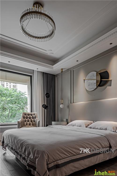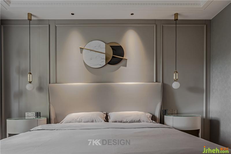 床頭柜上方擺放業(yè)主平時(shí)使用物件和精致的擺件,吊燈也是精心之選,小巧精致。