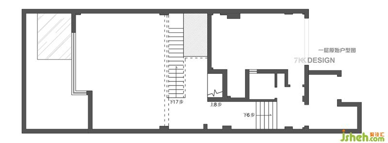 (一層和二層)夾層原始戶型圖 原始一樓到夾層的動線,使得夾層和一樓互動比較獨立,由于一樓的衛(wèi)生間拆除,要借用夾層的空間設計衛(wèi)生間區(qū)域。