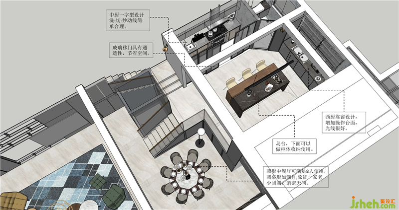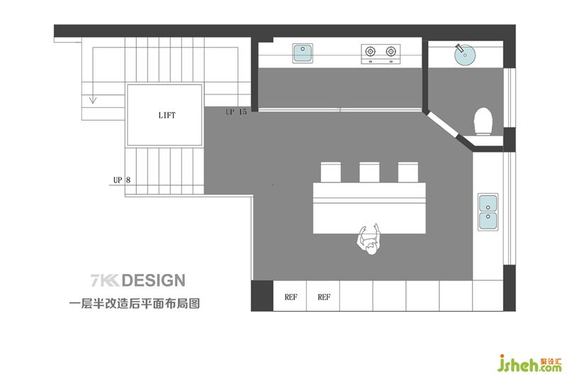 (一層和二層)夾層改造后平面布局圖 夾層出去樓梯使用面積有25㎡ 1、把一層到夾層的樓梯位置改到和電梯一側后,使得夾層和一層的互動更近距離,大人在樓上做事情可以隨時看到孩子在樓下的動向。 2、中廚一字型設計,采用移門更節(jié)省空間。原始餐廳空間設計成西廚加島臺功能。一側定制到頂?shù)母吖?,容納設備柜和更多的儲物功能。 3、縮小原始中廚的面積,靠窗騰出的空間設計衛(wèi)生間,保留馬桶和臺盆的功能。衛(wèi)生間門一側斜角處理,為了容納馬桶的空間,讓衛(wèi)生間使用更寬敞舒適。