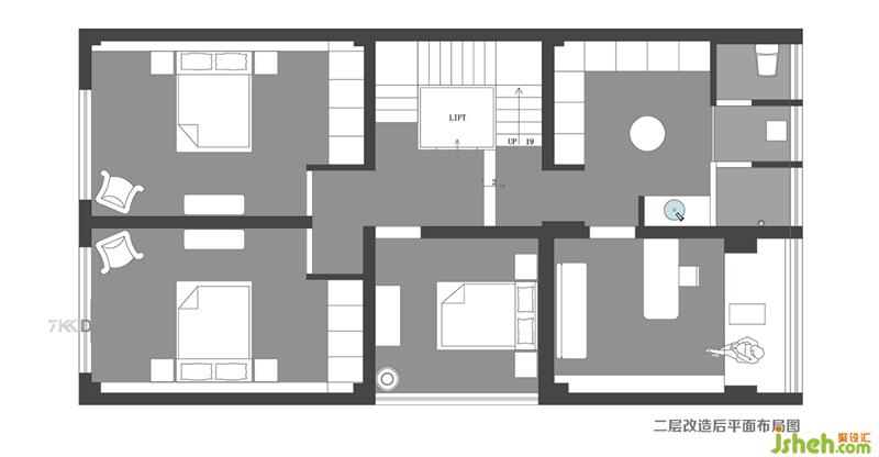 二樓改造后平面布局圖 二層使用面積有90㎡ 1、電梯兩側是上下樓梯的位置,朝南的兩間臥室一間為父母房,一間作為女兒房。中間搭建的房間作為客房使用。 2、錯層上來北邊的空間,一間作為多功能書房,另外一邊是衣帽間,衛(wèi)生間三分離設計,臺盆外置和衣帽間同一空間,馬桶和淋浴空間都靠窗設計,達到很好的通風效果。