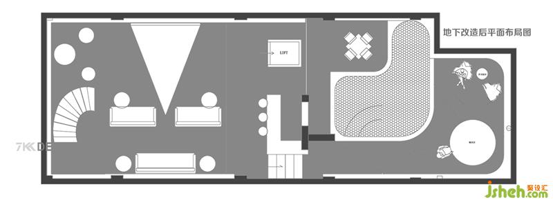 地下室改造后平面布局圖 地下室使用面積有145㎡ 地下室把原始樓梯改到南邊一側和一樓挑空設計,為地下室引入更多自然光線,達到更好的通風效果,地下室主要功能為影音室和兒童游樂園,為兒童打造夢幻天地。