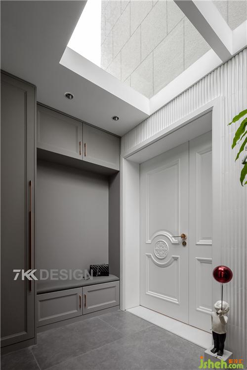 入戶門(mén)外邊的小庭院雖然面積不大,但是效果很贊,頂部采用透明玻璃頂,采光充足??繅D(zhuǎn)角做到頂?shù)母吖?換鞋凳一體設(shè)計(jì),進(jìn)門(mén)可以放置臨時(shí)進(jìn)出的物品,坐著換鞋很方面。柜體選擇高級(jí)灰,進(jìn)戶門(mén)選擇白色歐式造型門(mén),高貴莊嚴(yán)大氣又含蓄雅致。最吸引眼球的是角落的裝飾品,小孩拿著紅色的氣球,似乎在迎接主人到來(lái),很有樂(lè)趣。讓莊重內(nèi)斂的庭院瞬間變得活力有趣味。