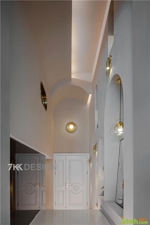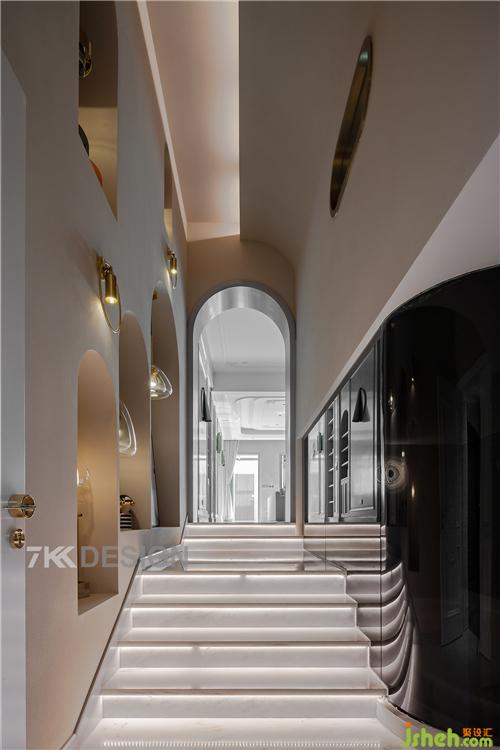 從臺(tái)階上來(lái)還有著3m的高度,其中拱形造型的應(yīng)用讓空間在視覺(jué)上顯得更高,呈現(xiàn)柔和優(yōu)美的曲線和弧度。進(jìn)門(mén)頂部的弧形和到客廳的弧形造型相呼應(yīng),與客廳之間起到空間上的隔斷和過(guò)度。從進(jìn)門(mén)可以看到很多金屬元素的應(yīng)用,點(diǎn)綴出不一樣的輕奢感。 左邊弧形玻璃上面我們看到金屬邊框的造型,從夾層可以看到它的驚艷之處,透過(guò)玻璃可以看到樓梯走廊空間的動(dòng)向。