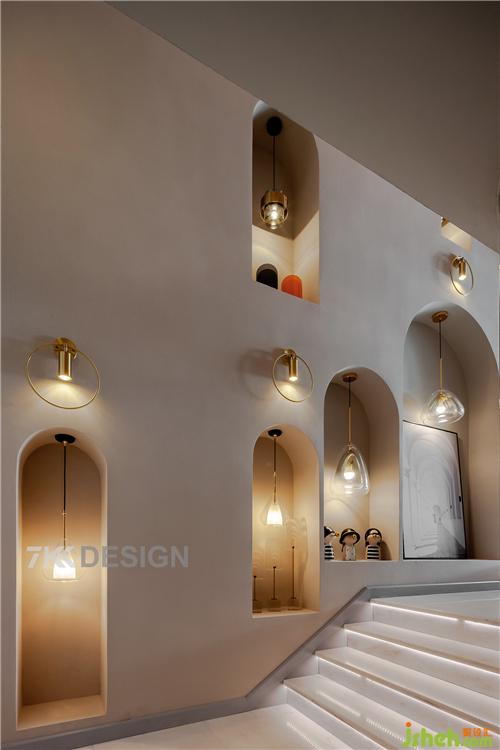 拱形造型沿著臺(tái)階高度設(shè)計(jì),里面搭配精致吊燈,上面擺放可愛(ài)的裝飾品藝術(shù)掛畫(huà),充滿文藝感,又有一絲童趣活力在里面。如果弧形的玻璃預(yù)留一扇門(mén),這里也將成為小孩子玩耍的快樂(lè)天堂哦。#樓梯 #擺件 #裝飾畫(huà) #吊燈 #壁燈