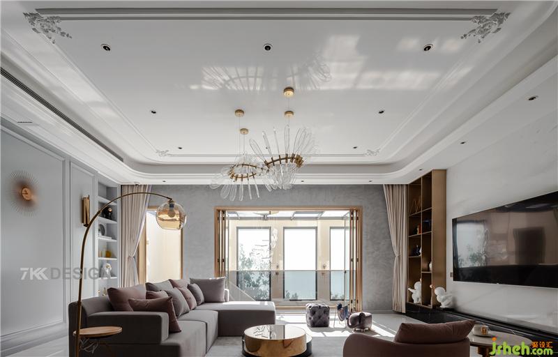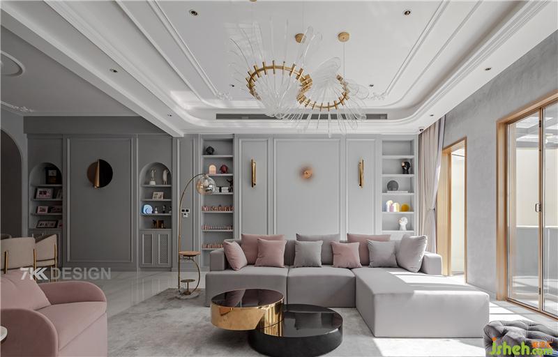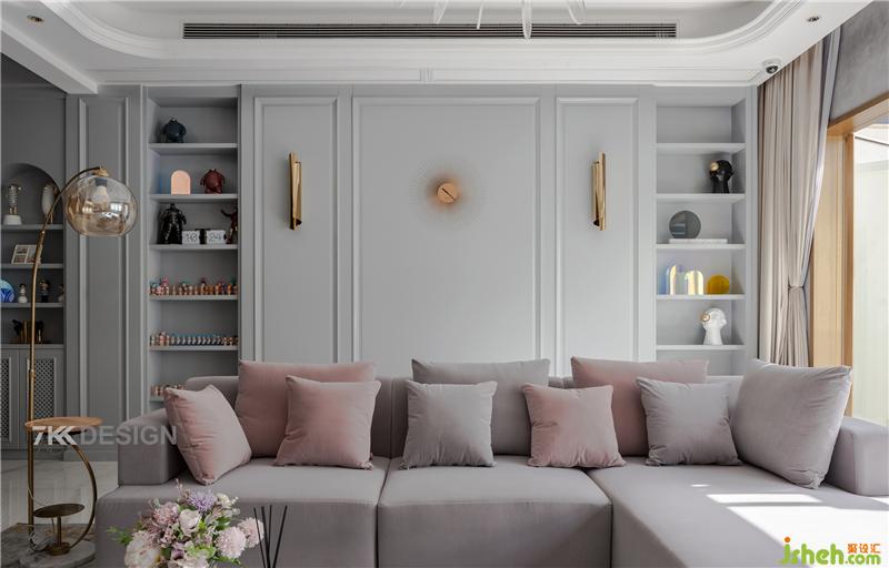 客廳進(jìn)來(lái),整個(gè)墻面延續(xù)之前的拱形門(mén)造型與層板結(jié)合,上面擺放精致的裝飾品,美觀與實(shí)用并存。客廳白色與灰色為基調(diào),金屬元素點(diǎn)綴。軟裝上搭配粉色系,打破客廳的清冷與單調(diào)。頂部不同區(qū)域的吊頂處理使得空間層次感更加豐富。午后的陽(yáng)光透過(guò)大面積的玻璃窗照瀉進(jìn)來(lái),很明媚的感覺(jué)。