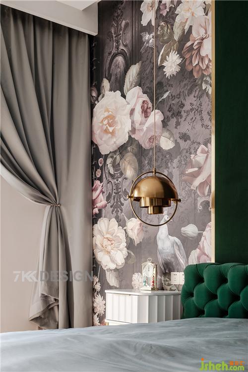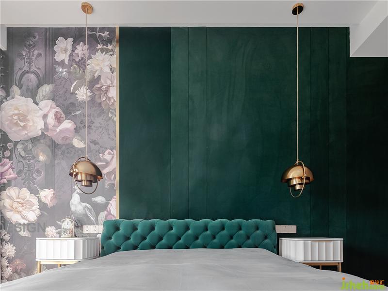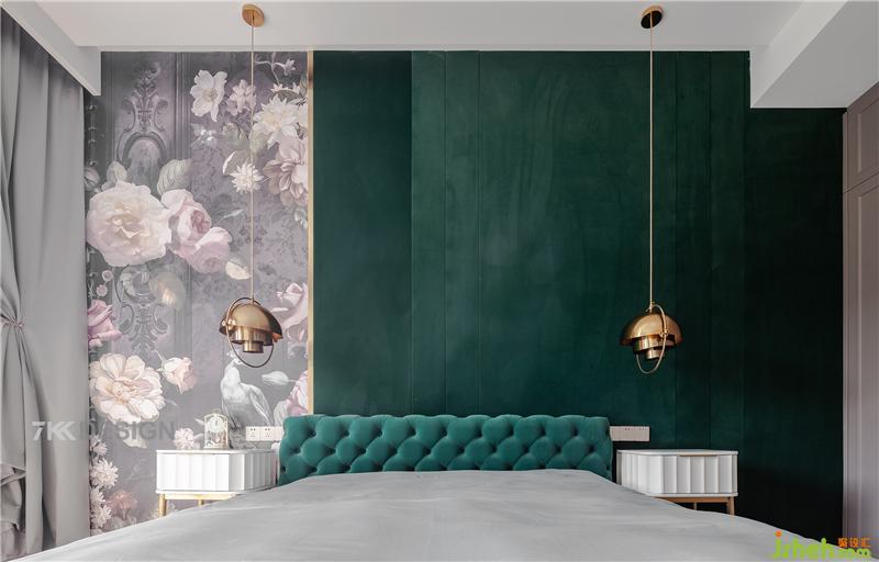 為方便父母的使用,把二樓朝南的一間臥室作為父母房,可以看出業(yè)主對父母深切的愛。父母房床頭背景墻采用大面積墨綠色與花型圖案拼接,床也選擇墨綠色軟包樣式,短毛絨布,手感柔和,輕奢典雅。細(xì)看吊頂內(nèi)嵌燈帶,打開燈有種科技感相融合。